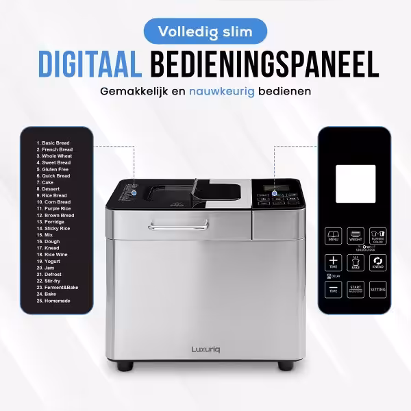 Geniet elke dag van vers brood met de Luxuriq broodbakmachine. Met 25 programma’s, timer, warmhoudfunctie en automatische noten- en fruitdispenser bak je makkelijk brood op jouw manier.