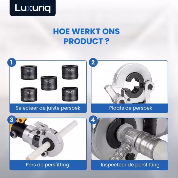 Wacht niet langer en voeg de Luxuriq® Perstang TH Set toe aan je gereedschapsarsenaal. Ervaar zelf de perfecte combinatie van kracht, precisie en gebruiksgemak. Geschikt voor de zwaarste installaties, betrouwbaar bij elke klus.