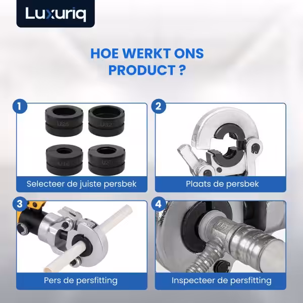 Of je nu werkt aan waterleidingen, verwarmingssystemen of sanitair: de Luxuriq perstang garandeert duurzame, lekvrije verbindingen. En dankzij de compatibiliteit met merken als Bonfix, Esta Rohr, Geberit Mapress en VSH XPress, is deze U-set breed inzetbaar op vrijwel elk type klus.