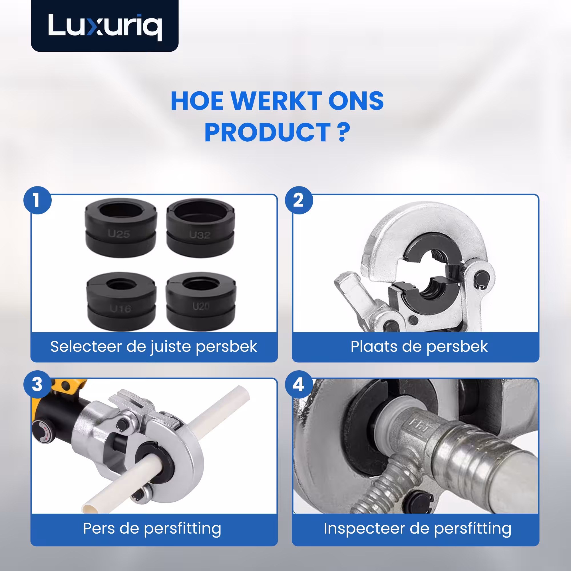 Of je nu dagelijks installaties uitvoert of af en toe zelf klust: met de Luxuriq® Perstang U Set haal je professioneel gereedschap in huis waarmee elke persverbinding in één keer goed zit. Kracht, precisie en gebruiksgemak – allemaal in één set.