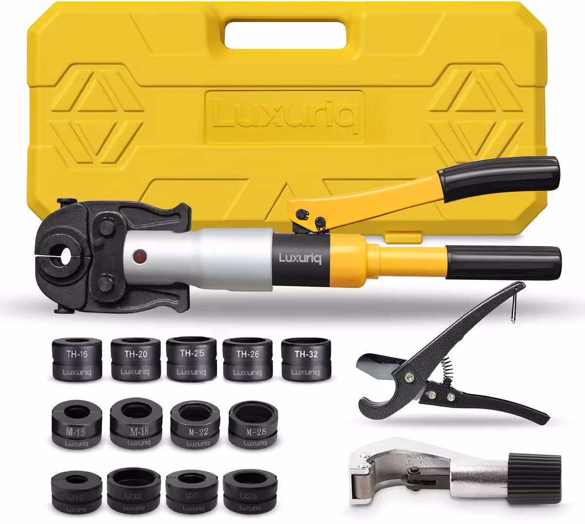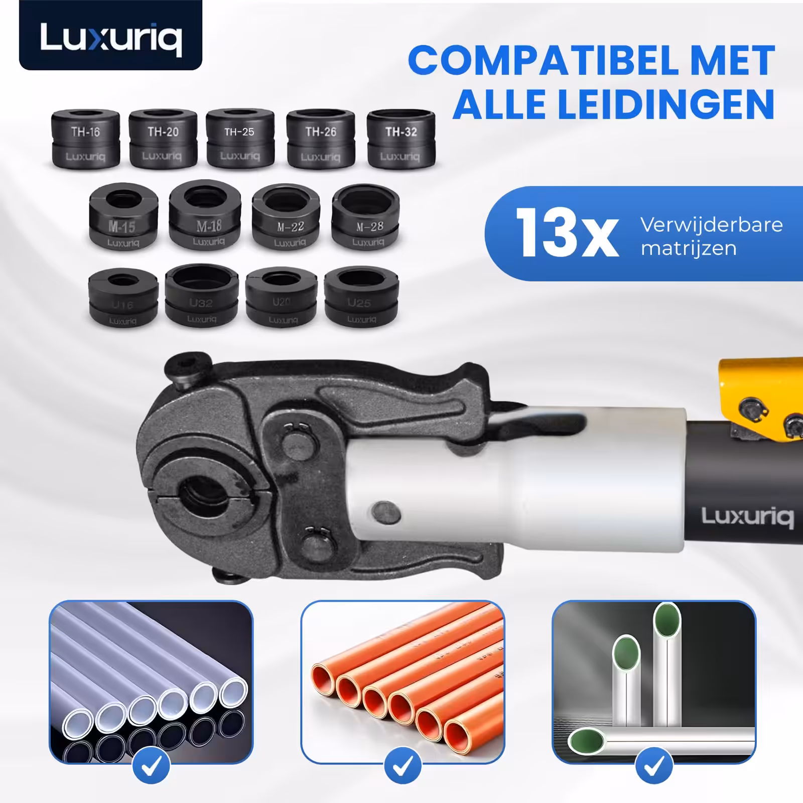 De Luxuriq® 3-in-1 Hydraulische Perstangenset levert professionele perskracht met 13 geharde bekken (TH, M & U) en een 360° draaibare kop. Voor snelle, lekvrije verbindingen op kunststof, RVS en koper.