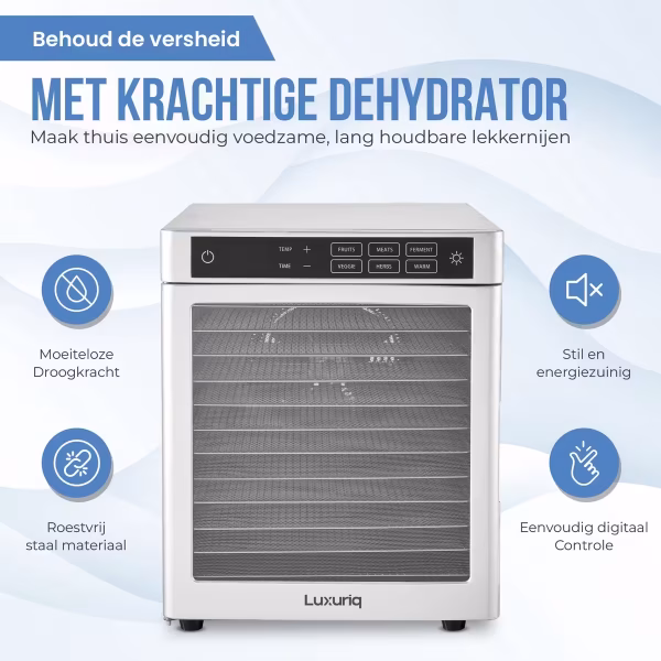 Zeker. De Luxuriq SS-12F heeft een LED-touchpaneel waarmee je de temperatuur (30–85°C) en droogtijd (tot 24 uur) eenvoudig instelt. Daarnaast kun je kiezen uit voorgeprogrammeerde droogstanden voor verschillende soorten voedsel.