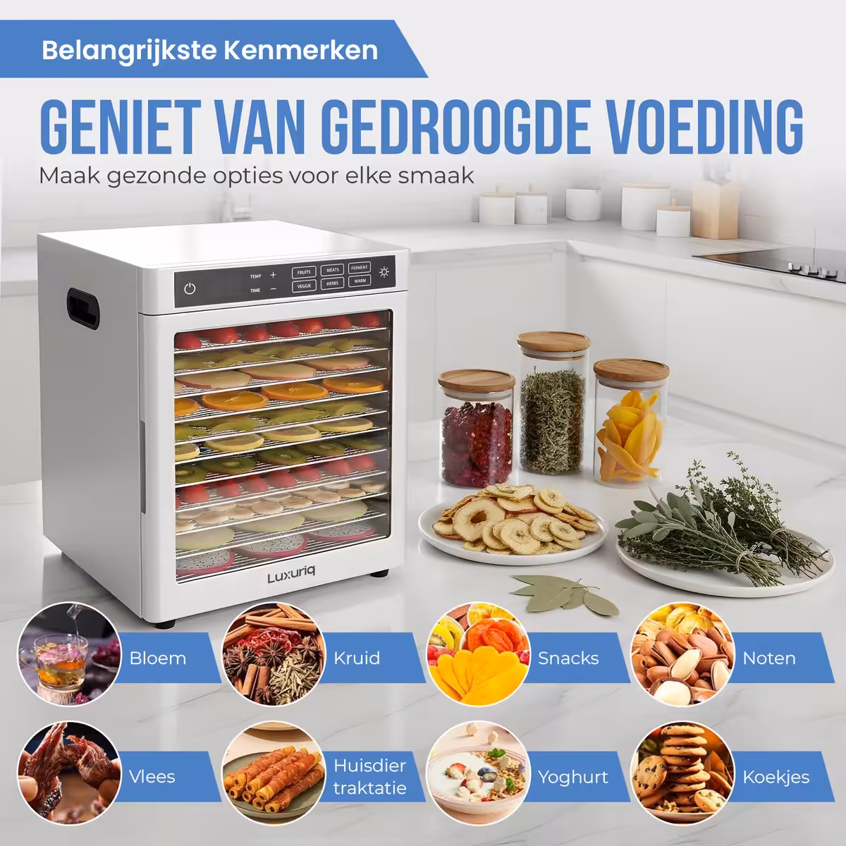 Zeker. De Luxuriq SS-12F heeft een LED-touchpaneel waarmee je de temperatuur (30–85°C) en droogtijd (tot 24 uur) eenvoudig instelt. Daarnaast kun je kiezen uit voorgeprogrammeerde droogstanden voor verschillende soorten voedsel.