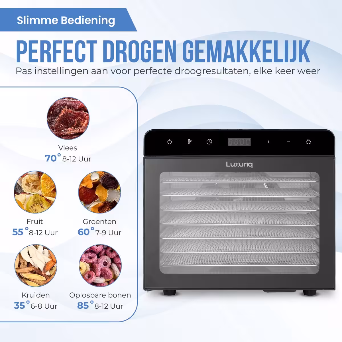 De Luxuriq Voedseldroger maakt gezonde snacks thuis eenvoudig. Met 8 RVS-droogrekken, 30–85°C en 360° luchtcirculatie droog je fruit, groenten, vlees en kruiden gelijkmatig. Stil, met LED-touchbediening en inclusief receptenboekje.