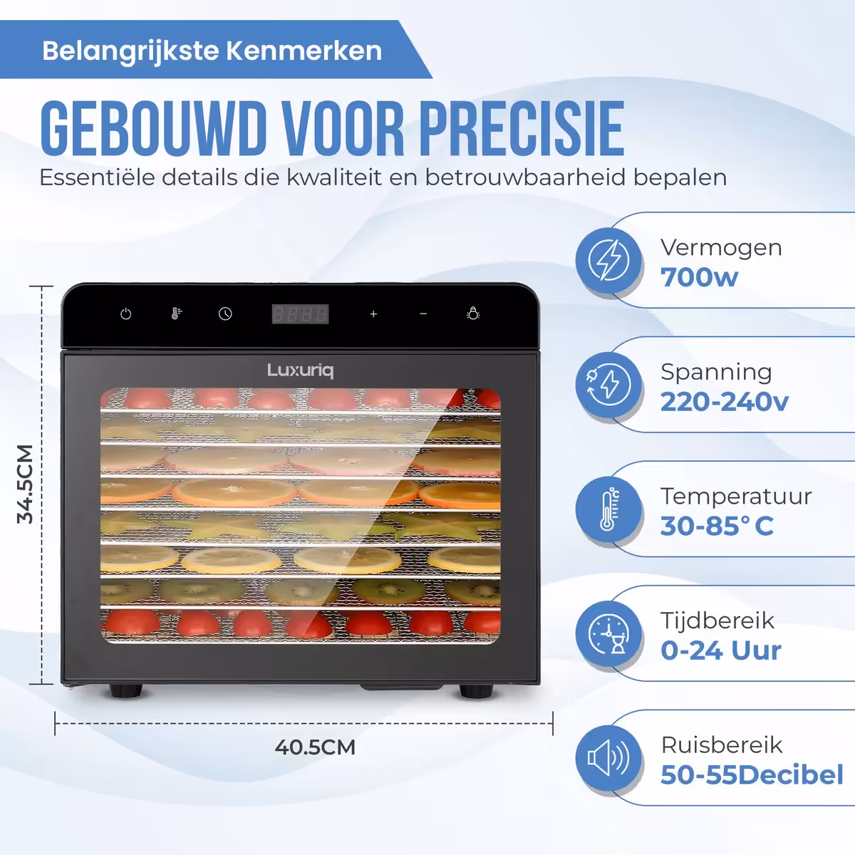 Een goede voedseldroger draait om controle. Met het LED-touchpaneel stel je eenvoudig de temperatuur in van 30°C tot 85°C, perfect voor elk ingrediënt: