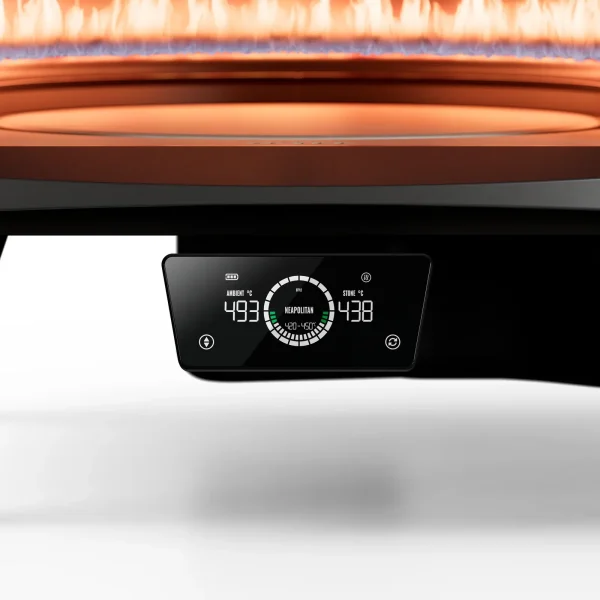 De Rotante Control-versie onderscheidt zich door zijn geavanceerde besturing. Het heldere LCD-scherm toont in één oogopslag alle essentiële informatie: de temperatuur van de oven, de temperatuur van de pizzasteen, de status van de brander en de rotatie van de steen. Dankzij meerdere intelligente temperatuursensoren en een slim algoritme wordt de warmte continu gemonitord en automatisch bijgestuurd. Zo weet je zeker dat jouw pizza exact goed gaart, zonder giswerk.